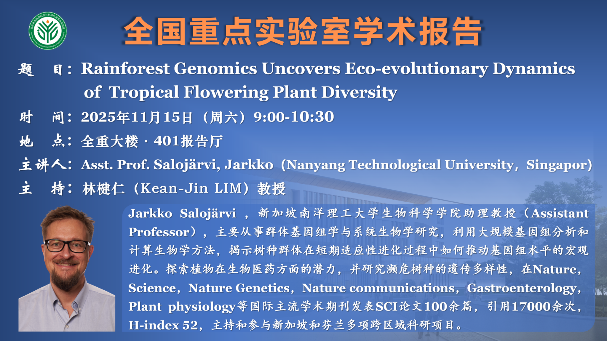 学术报告:Rainforest Genomics Uncovers Eco-evolutionary Dynamics of Tropical Flowering Plant Diversity